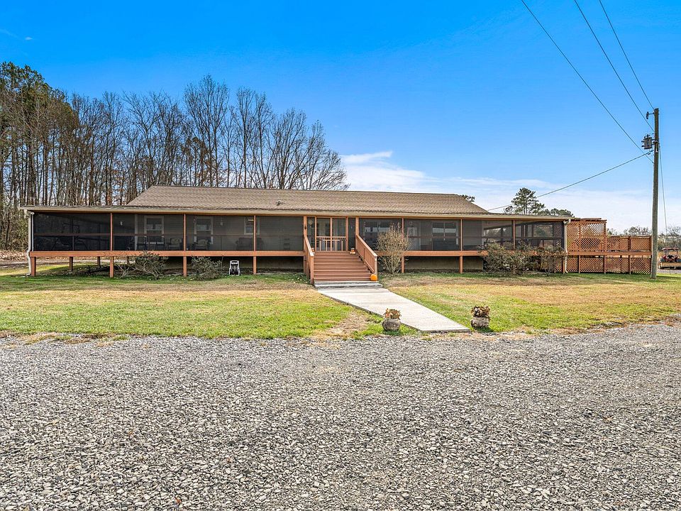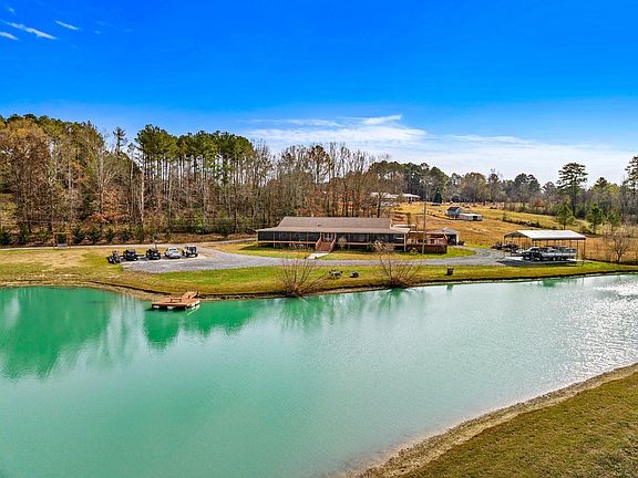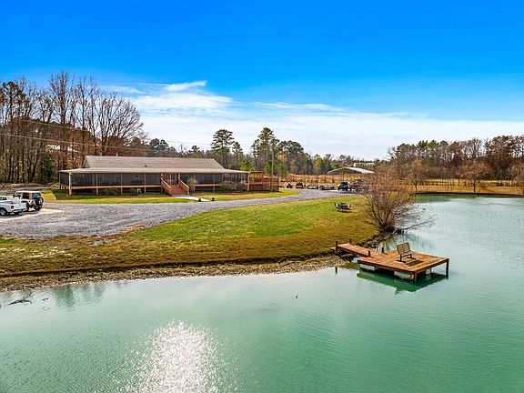 Discover the epitome of country living in this 4-bed, 3-bath, 2400 sq ft home on a sprawling 9.77-acre property. Embrace the charm of 9-ft ceilings complemented by recessed lighting. Step outside onto the 12ft wide, fully screened wrap-around porch, overlooking two serene ponds and a babbling creek. The larger pond, stocked with catfish, is aerated for optimal health. Parking is a breeze with a generous 24x36 camper-sized carport and a detached garage/carport featuring a lean-to and roll-up door. An Amish outbuilding (12x32) with a roll-up door adds to the versatile options this property offers. Luxuriate in the master bath's jetted tub and rest easy knowing there's a storm shelter rated for winds up to 250 mph for 3 seconds. The outdoor oasis includes a pool, with all items staying (excluding the robot vacuum and chemicals), and a utility sink on the porch for added convenience. Stay cozy with a gas fireplace fueled by a fully filled 100 lb propane tank. Practicality meets style with built-in pool storage on the porch. This property invites you to savor peaceful country living with modern amenities and thoughtful details.