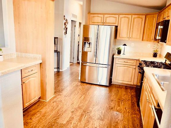 Pristine 3 bed/2 bath 2006 Palm Harbor mobile home with factory-built, covered deck boasting AMAZING canyon views! Open floor plan with large gourmet kitchen, ample cabinet/counter space, additional built-in pantry, recessed lighting, under-cabinet lighting, newer appliances, Central AC/Heat. Dining area with ceiling fan and custom-built wall-to-wall cabinetry. Laminate wood flooring in the living areas. Hall coat closet and ceiling fans in all rooms. The amazing master suite features a walk-in closet, an en-suite bathroom, a large garden tub, linen, and an extra closet. Full perimeter concrete foundation, new retaining wall, upgraded outside electrical panels, wood fence & custom patio fan. Three sheds for storage. Quiet, well-maintained family park minutes to freeways 163/805/5, beaches, Seaworld & USD. Pride of ownership shows throughout!