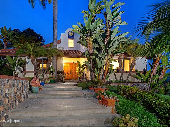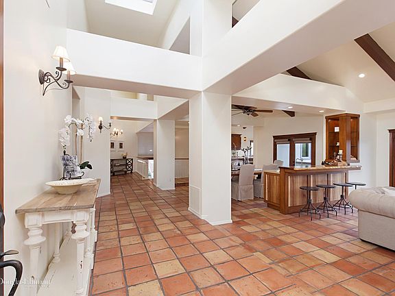 Enjoy the feel of a year-round vacation at this custom resort-inspired Spanish hacienda in the pastoral hills of San Juan Capistrano. Framed by graceful palms and verdant lawns, the multi-level residence is light and airy thanks to an abundance of windows, French doors, vaulted and beamed ceilings and large skylights. Spanish-tile flooring embellishes the main level, new carpet adorns select rooms, and ceiling fans and fresh interior paint are featured throughout. Measuring approx. 3,382 sq ft, the 4-bedroom, 4-bath design displays inviting fireplace-warmed living and great rooms, a dining room, remodeled wet bar with wine refrigerator, and a recently remodeled gourmet kitchen with island, handsome tile work, custom cabinetry, Caesarstone quartz countertops, and stainless steel appliances including a built-in refrigerator and commercial-grade Thermador range. The lower level features a guest room/office and an adjacent bath, and a grand master suite is distinguished by a stone fireplac