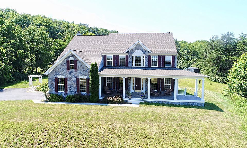 From a massive 42x10 front porch to an over-sized pergola-covered stamped concrete patio, this home takes full advantage of the amazing views it commands. Located on 6+ partially wooded acres, this large stone-front Colonial offers plenty of outdoor country living and indoor luxury. Inside is a welcoming open floor plan featuring a dramatic two-story foyer, hardwood floors, recently remodeled kitchen including stainless appliances, induction cooktop, convection microwave, granite countertops, island, and double oven, wood-burning fireplace in the family room, upper level with four bedrooms including an enormous Master Suite with cathedral ceilings, sitting area, huge walk-in closets, and luxury bath. Convenient bedroom level laundry room! The basement has a wet-bar/secondary kitchen and unfinished spaces ready to be finished to your liking to add additional living space. The home has recently upgraded dual zone heating/cooling and is serviced by a whole-house water filtration system. Outside are a seasonal pond, raised-bed vegetable and flower gardens and a large storage shed. Beautiful location with spectacular mountain and forest views!