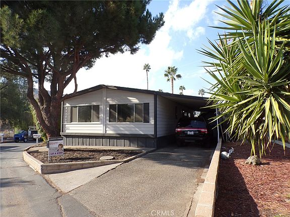 Welcome to Your new home located in beautiful Reche Canyon! REMODELED kitchen with top of the line cabinetry, self closing drawers & cupboards, H-U-G-E Island Breakfast Bar and workspace in gorgeous Granite. Kitchen is open to Great Room, Dining and Family Room. Custom built "BARN DOORS" for closets is both bedrooms, So much to see & enjoy! Very private corner lot with an ADD-ON Screened Room, steps to luscious back yard with lots of fruit trees, greenery, tall fencing for extra privacy with a peaceful sitting area under the shade trees. Carport covered parking for THREE CARS too. What a great place to live with easy access to Moreno Valley, Riverside, Colton and Loma Linda and a Signal light at park entrance. Searching for serenity? This Beautiful park is quiet and well kept. (Ser.# A/B5SC1302CA) Lot rent is $1025.00/mo. This home is move in ready and very nice floor plan, it is a must come and look at, so Call us to get PRE QUALIFIED and make an appointment to view this home TODAY!
