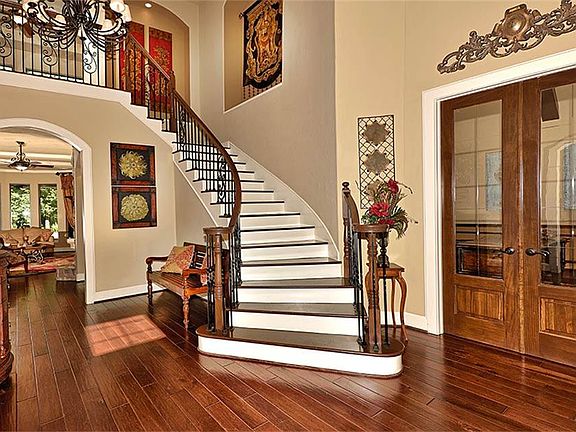 Gated home nestled on over 1 acre in Benders Landing! Soaring ceilings, wood flrs, wrought iron stairs, crown moulding, storage & built-ins throughout. Gourmet island kitch w/granite counters, bkfast bar, stained cabinets, SS appliances & dbl oven opens to bkfast & den w/stone FP; wine rm; study w/beam ceiling & French drs; mstr down w/sitting area & spa-like bath; gmrm, media & 3 bdrms up; covered patio w/gorgeous pool, spa, firepit & outdoor shower overlooks a lush greenbelt, ensuring privacy.