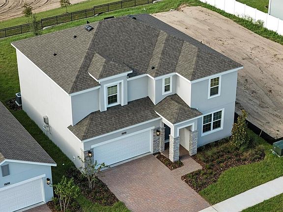 Step into modern comfort with the stunning Newcastle plan—an open-concept home offering 5 spacious bedrooms and 3.5 baths, including a private 1st floor guest suite with ensuite bath and walk-in closet. The 1st floor main living areas feature elegant 12x24 tile flooring in an offset pattern, and impressive 9'4" ceilings throughout the 1st floor create an open and airy feel. The beautifully upgraded kitchen includes 42” cabinets, quartz countertops, tile backsplash, stainless steel appliances (including refrigerator), and a large pantry closet. The Great Room flows seamlessly into the Café and out to a covered lanai with no rear neighbors—ideal for relaxing or entertaining. Upstairs, a spacious loft provides additional living space, while the luxurious Primary Suite features an ensuite bath with walk-in closet, dual sink vanity, and a tiled walk-in shower. Blinds are included throughout, and the convenient laundry room comes complete with washer and dryer. With stone accents on the exterior, a brick paver driveway and lead walk, and attractive landscaping, this home blends style and functionality inside and out. Community amenities include Resort-style Pool and shaded Playground. Eagletail Landings is located just south of Lake Harris and near some of the best outdoor recreation in the state as well as Lake County's breathtaking chain of lakes and scenic trails, and a thriving downtown area is just a short drive away, along with 2 nearby championship golf courses designed for a challenging and enjoyable day on the greens.