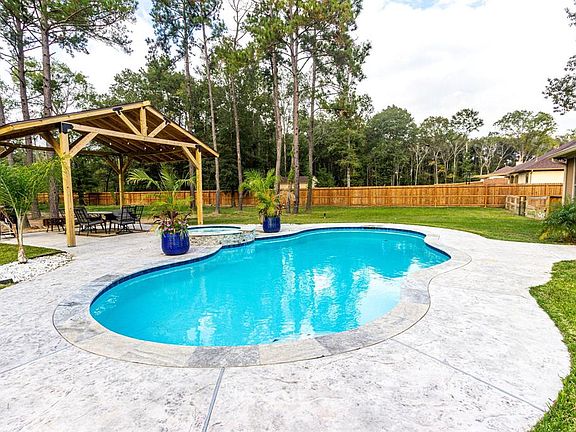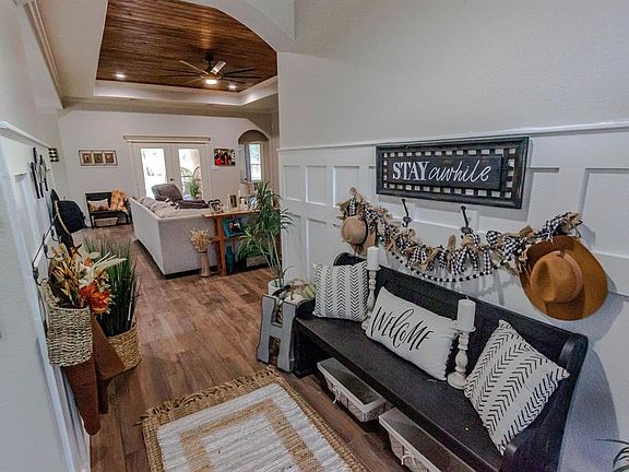 Welcome Home! Situated on over an acre lot, this beautiful Pinterest-Worthy home has tons of upgrades and has NEVER FLOODED! No carpet or cheap flooring here, wood-look tiled floors were installed throughout the entire home! New paint throughout - including the kitchen cabinets, completely remodeled kitchen with beautiful quartz countertops and the kitchen island will be painted the accent color of your choice! The living room and primary bedroom both feature beautifully eye catching wood accented tray ceilings that you must see! The current office can also be used as a dining room and features a custom shiplapped accent wall. If the inside isn't great enough, there's a custom HEATED swimming pool (just in time for winter) and a huge patio gazebo awaiting you in the backyard! It is fully fenced and also sub-fenced for pets, with a side driveway gate access and large storage building. Don't miss out, schedule a showing today!