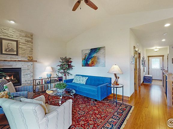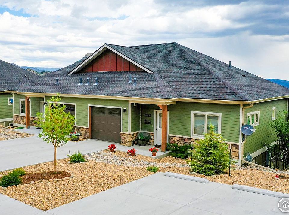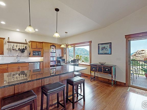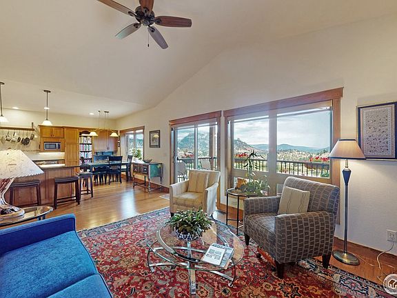 Beautiful light bright mountain condo w/ stunning unobstructed views of Mummy Ridge, Mary's Lake, Prospect Mountain, and Sheep's Rock. Nearly new, clean & well cared for home located in accommodation district (short term rental permit not required), can be used as permanent residence, weekend get away, short term or long term rental. Enjoy the views & wildlife from the bay window and decks. Some furniture included. 6 panel doors throughout, kitchen, dining, and living rooms w/ cathedral ceiling + fan. Gas fireplace w/ floor to ceiling stone and beetlekill pine mantel. Wall right of fireplace wired for TV. Sliding glass doors to deck & large double window with remote control Bali Sunshades. Granite Peninsula (38"x82") w/ 4 seats & pendant lights. Stainless steel GE Profile appliances including induction cooking surface & convection oven range for faster cooking at higher altitude. Granite counters with decorative ceramic surround. 2 additional parking spaces.