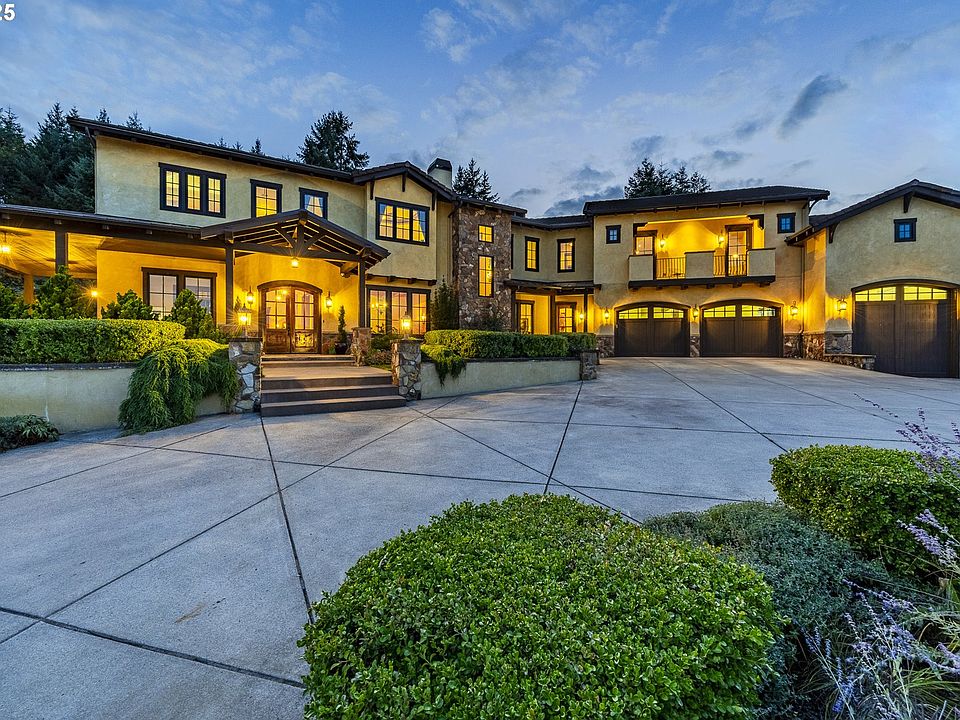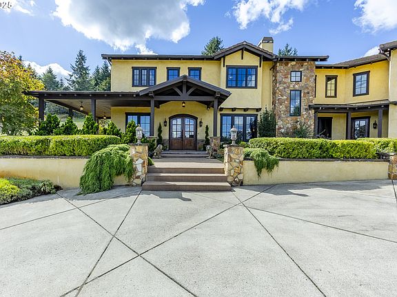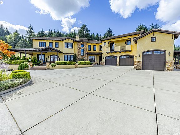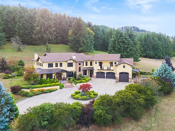 Dreaming of a slice of Tuscany in Eugene complete with sweeping pastoral and mountain views and an exceptional equestrian setup? This breathtaking gated and fully fenced 32-acre estate, featuring a Tuscany-inspired villa designed by dC Design and built by dC Eugene, blends timeless design with the natural beauty of the surrounding landscape. Throughout the home, you will find views from every window and the finest materials: hand-scraped hardwood floors, wrought iron details, vaulted ceilings with wood beams, a floor-to-ceiling custom fireplace, built-ins, balconies, and thoughtful touches that highlight craftsmanship at every turn. The culinary kitchen is truly a centerpiece, designed for those who love to cook and gather with custom cabinetry, granite counters, high-end appliances, breakfast nook, and wine room that makes it as functional as it is stunning. The beautiful primary bedroom suite offers a fireplace, spa-style bath with soaking tub, dual vanities, walk-in shower, and walk-in closet. A second ensuite bedroom is located on the main level, with two additional bedrooms and a shared bath upstairs. The family room features a wet bar, full bath, fireplace, pool table room (pre-wired for a theater room) and access to a veranda and patio with a spiral staircase—ideal for entertaining or as a potential guest suite. Designed for an equestrian and recreational lifestyle the estate includes an oversized two-car garage plus RV bay with hook-up, fenced pastures, a 6-stall barn with heated tack room, ½ bath, hay storage, and an indoor arena with viewing gallery, creating the ultimate equestrian lifestyle. Whether training, riding, or simply enjoying the peace of wide-open land, this is a place where every day feels inspired and is just minutes from Eugene.