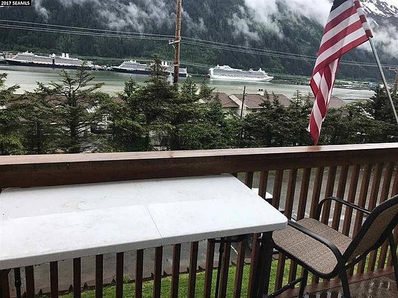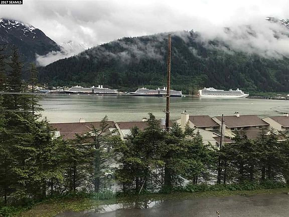 Stunning views from this upper end unit 2 bedroom condo in Douglas. As an end unit it has extra windows and natural light. Views of water, mountains, the tram, town and Cruise ships from both living area deck and master bedroom. Lovely move-in condition, remodeled. Tile flooring in kitchen and baths. 1.5 baths, great convenient location just moments from downtown Juneau. Dues include heat and hot water! Great value a must see!