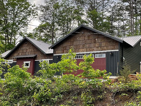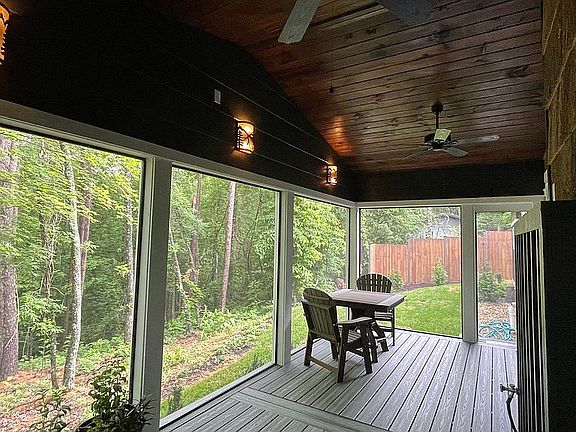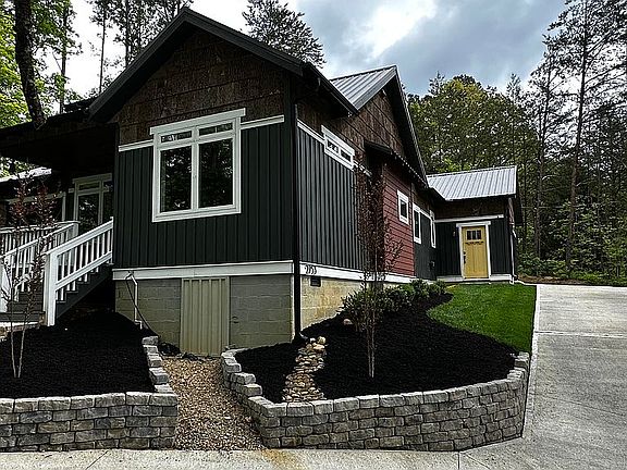 Craftsman home with durable cement board & batten siding, cement board lap siding, and natural poplar bark siding. Craftsman style windows and a metal roof bring the style together. A quaint open front porch is perfect for enjoying a cup of coffee in the morning while listening to the birds. On the back of the house is a large screened in porch off of the living room with privacy and a view of the woods. Inside, the walls are finished with pine 12" wide tongue and groove boards that are stained and sealed in a neutral gray color. The ceiling is unfinished 6" wide pine nickel board throughout and also in the garage. Stained ceiling beams have been placed in the kitchen, bedrooms, and living room. Two bedrooms each have their own attached bathroom. The gas fireplace is finished with a mantle, natural poplar bark, and black ceramic tile around the mission-style sealed cover. The kitchen has quarter sawn oak cabinets with quartz countertop and stainless steel appliances. The laundry room leads into the attached garage where there is ample parking for 2 cars and a workshop space in the back. A concrete driveway means low maintenance and durability.
