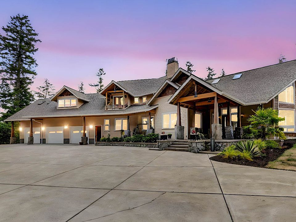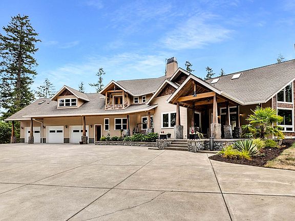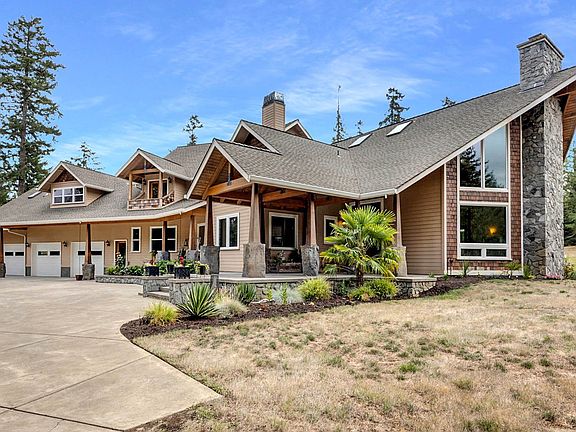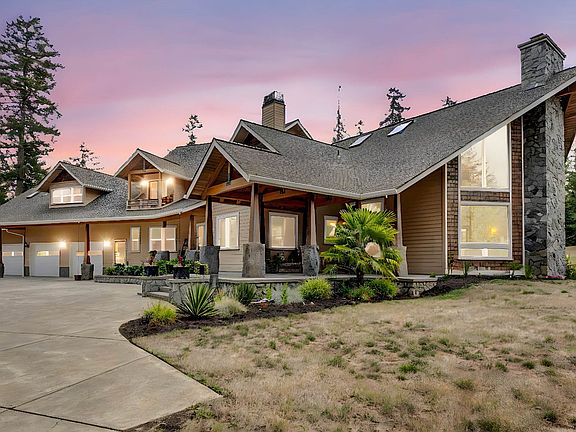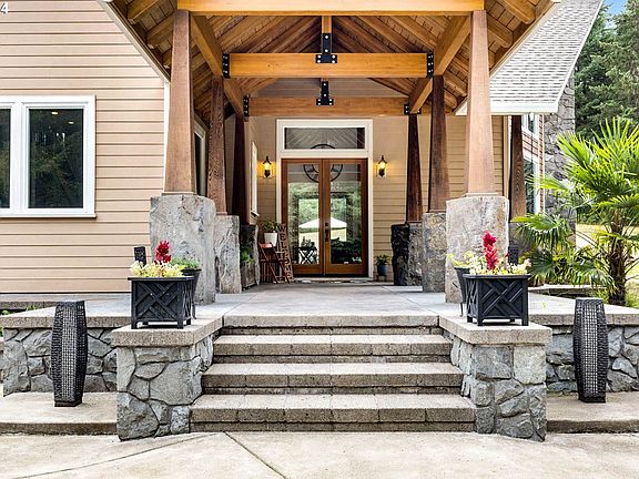 Welcome home to elegance! This exquisite 4 bedroom 7 bath craftsman chalet is nestled on a hilltop amongst 20 acres of trees and pastureland, on a private gated road, just minutes from Eugene. Be blown away just steps into the home by the soaring 25' vaulted ceilings with custom wood beam work, floor to ceiling river rock fireplace, and picturesque windows and skylights that bathe the room in sunlight. The spacious and charming gourmet kitchen that is open to the dining and living rooms, provides tons of storage and counter space, a large pantry, a breakfast nook for a less formal gathering place and bar seating at the cook island. The primary bedroom, located on the main level, has a double sided fireplace, french doors that lead out to the hot tub, and massive ensuite bathroom with soaker tub, dual vanity, walk in closet and large triple headed tile shower. Also on the main level you will find the 2nd bedroom with 15' ceilings, private ensuite bathroom and large closet. The 2 large bedrooms upstairs each offer a full ensuite bathroom as well as a walk in closet and private balcony with beautifully tranquil views of your own 20 acres and the valley and mountains beyond. Going up a second, private staircase from the family room you will find a 46'x26' bonus space with breathtaking views, that has available plumbing to build a wet bar or possibly be used to convert the space into a mother-in-law suite. Back downstairs and on your way out to the expansive 3 car garage you will find your laundry/mudroom with no shortage of cabinet space, cubbies to hang jackets and store shoes, a farmhouse style sink and full bathroom. In the garage you will find space for all your cars, bikes, boats, and other toys, along with your utility room that has your solar energy hub, backup generator, furnace, etc. The last can't miss area of the home is the basement that would be perfect as a wine cellar/tasting room. Visit the home's website link to see more photos, video, and the 3D tour.