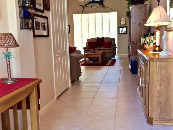 Water views & light easily flow into this immaculate, 1 level waterfront home built in 2001. Updated kitchen features solid surface Corian counters, glass tile backsplash, newer stainless steel appliances & wood cabinets. Pavered driveway/walkway leads to a beautiful etched glass double door entrance. Accordian shutters outside & interior wood plantation shutters in 2 bedrooms. Brand new LG washer & dryer; Garage includes extra fridge, workbench & built in storage cabinets. Situated on a larger lot, relax on the tiled, covered & screened back patio taking in the peaceful water views. Beautifully maintained, ''Mr & Mrs. Clean'' live here! (All property details/measurements approx. ) All ages, pet friendly, resort lifestyle without any club memberships! SEE HOA details in supplement.