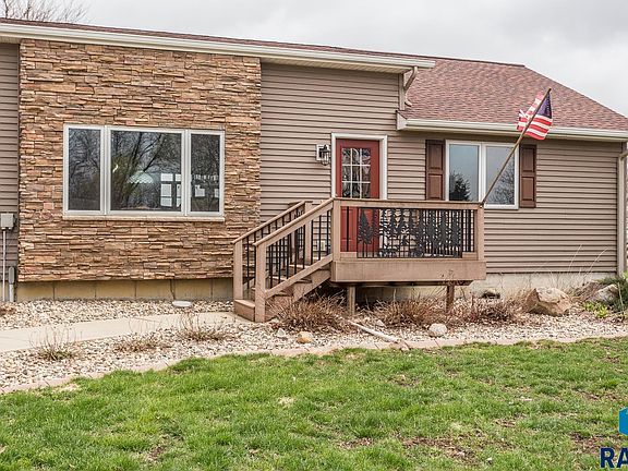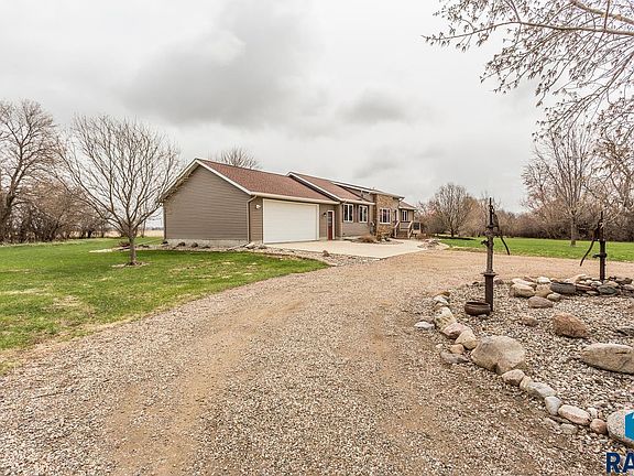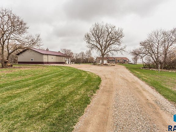Over 10 acres are included with 5 bed/3 bath ranch home and great outbuilding. This property offers a ranch style home with over 3,000 finished square feet. The main level has a open floor plan, including 3 bedrooms, laundry, and an impressive 3 season room with great views of the property. All 5 bedrooms have walk-in closets and the primary bedroom has a pass thru door to the bathroom. The basement living features a propane fireplace and three egress windows. 2 additional bedrooms and a full bathroom complete the basement, which also has an access to the garage. The 68x46 outbuilding is a great bonus to this property for storage and an additional workspace. 22'x46' area is finished and heated. 46'x38' is open storage w/ cement floor and electrical. Landscaping and mature trees complete this acreage that is conveniently located on a blacktop highway within 25 minutes of Sioux Falls.