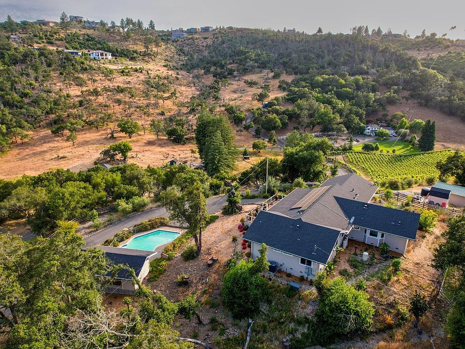 Custom knoll-top home built in 2021! The home was thoughtfully designed with beautiful views in all directions. The 8.31 acre property is private and gated in one of Santa Rosa's most desirable neighborhoods. There is a 4 acre Zinfandel vineyard in Fountaingrove AVA, strong well and multiple out buildings. What is now a new shop was formerly a studio and could be converted back. Sparkling in-ground pool with newly constructed pool house. Home has high end appliances, Knotty Alder floors, cabinets and 8ft doors. New Generac Generator and a Tesla Solar System.
