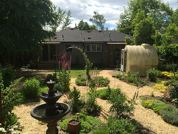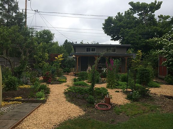 Artistic 2+ bedroom, 1 bath home with permitted accessory building with electricity in desirable SE Eugene neighborhood! This beautiful cottage features a tastefully integrated garage conversion with cozy wood stove (possible third bedroom with addition of closet), glowing hardwood floors thru-out, artistic accents, lovingly landscaped gardens w/high-quality Solar Gem greenhouse, raised beds & stone pathways and much more!