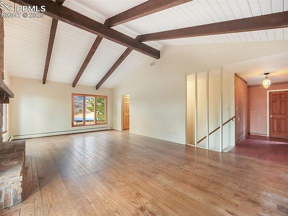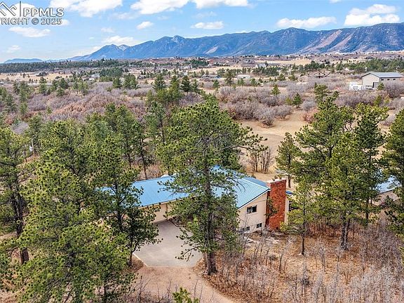 Located on the west side of Monument in the desirable Panoramic Acres community and within sought-after School District 38, this private, treed property offers a rare opportunity to own 8.93 acres of Colorado beauty. Surrounded by mature trees, the setting provides exceptional privacy and room to bring your vision to life. The home features a durable metal roof, an oversized two-car garage, and a spacious front deck ideal for enjoying the peaceful surroundings. A brick entry welcomes you inside, where the family room showcases wood flooring, vaulted ceilings with exposed wood beams, and a striking stone fireplace. The kitchen is thoughtfully designed with stainless steel appliances, a cozy dining nook, and a large walk-in pantry. The main-level primary bedroom offers convenience and comfort, complete with an adjacent bathroom featuring wood flooring and a large tub and shower combination. Additional living space includes a living room with wood flooring, a wood-burning fireplace, and access to a private balcony. The walk-out basement includes a laundry closet, two additional bedrooms with tile flooring, a full bathroom, and a spacious recreation room or second living area with an attached office. Outside, the property continues to impress with a barn that, with a little work, is ready for horses. Additionally the backyard features a tranquil koi pond and an abundance of mature trees. This is a rare opportunity to own nearly nine acres on the west side of Monument, offering endless potential for those ready to turn dreams into reality.