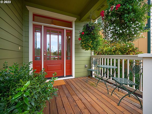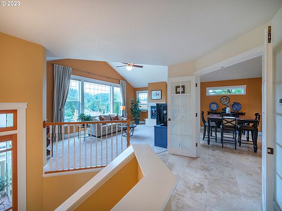Lovely contemporary home set on a hillside with sweeping views over Laurel Hill Valley. The front yard features a custom-designed terraced garden with thoughtful plantings adding color and texture year-round. The home offers great separation of space, with vaulted ceilings and luxurious Travertine tile floors adding a touch of elegance. The living room features a cozy gas fireplace and abundant windows to capture the peaceful views. The gourmet kitchen offers a large cook-island with eating bar. The primary suite is a true retreat, featuring two walk-in closets and an ensuite bathroom with a luxurious soaking tub and a walk-in shower. Each of the three bedrooms comes with its own full bathroom, ensuring privacy and convenience. The versatility of the main level bedroom allows you to use it as a den or office, complete with French doors that open to the private covered patio at the back of the home. The patio is thoughtfully designed with a low enclosed wall and surrounded by a variety of lush shade loving plants. The lower level provides extra storage space in addition to the garage. Conveniently located with easy access to UO and I5.