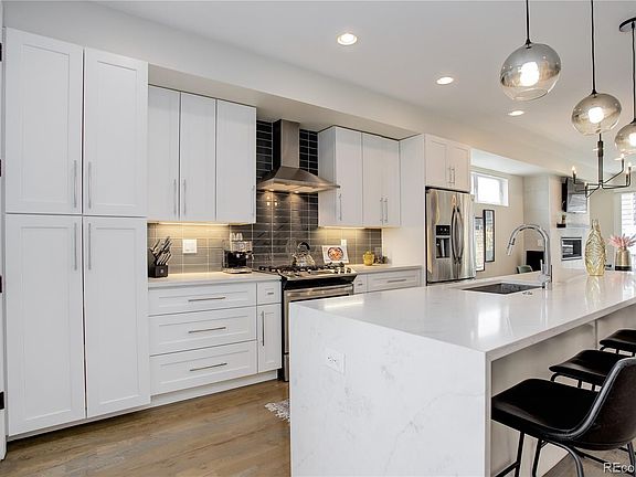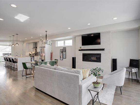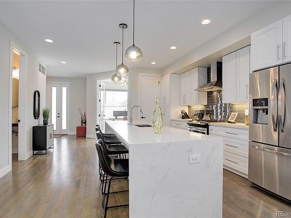 Escape to this modern, luxurious residence in the heart of one of Denver’s most desirable neighborhoods. Newly constructed in 2018, this home showcases stunning design throughout, including gorgeous hardwood flooring, a floating staircase, contemporary finishes, and clean aesthetics. Tucked away, behind glass doors, in the front of the home is an ideal location for an office or playroom. The chef’s kitchen affords the perfect blend of function and design with an impressive ten-foot-long waterfall Quartz island, chic backsplash, stainless steel appliances, and its seamless flow to the dining and living areas. Expansive accordion glass doors lead out to a covered patio and backyard perfect for hosting guests. On the second level, the primary suite with vaulted ceilings, a Juliet balcony, and spacious closet is sure to impress. The adjoining primary bath feels spa-like with a huge walk-in frameless glass double-headed shower, freestanding soaker tub, and Quartz double vanity. The two secondary bedrooms bask in natural light and share the convenience of a beautiful bathroom with double vanity. Retreat to the third level for outstanding mountain views and a wraparound rooftop deck giving you the quintessential spot to watch the famous Colorado sunsets all while enjoying a beverage from the swanky enclosed bar area. The massive basement space with egress windows is perfect for a theater room, playroom or a gym and has a fourth bedroom with another stunning bathroom. Convenient walking distance to an array of eateries and shops in the South Broadway neighborhood, close to parks and bike paths, this location can’t be beat!