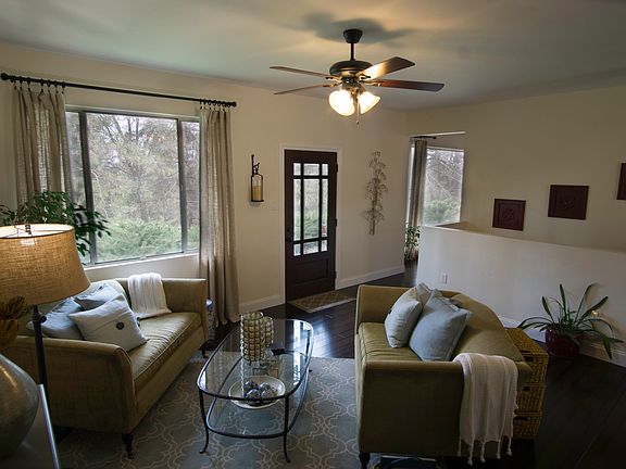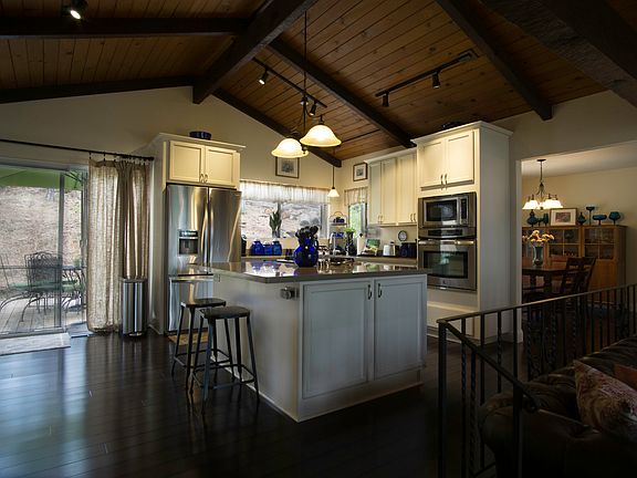This home is located at the end of the road, providing extra privacy. Grand vaulted open beam ceiling in the living room and kitchen. Living room has a large window with tree views and white washed fireplace brick that runs up to the ceiling. Gorgeous granite countertops and large island in the kitchen, as well as plenty of pantry storage cabinet space and built in desk. Master suite has a large walk-in closet, outside access, tile shower and double vanity. Partial finished basement for extra storage or bonus room with additional storage space under the house. The garage is oversized with workshop space. Private, fully fenced backyard with deck, raised garden beds and shed. Plenty of parking with room for RV.