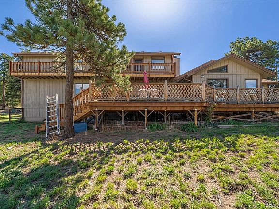 This mountain home features a Spectacular straight on Mt. Evans view to include Longs Peak! The home is 1429 finished sq ft plus an additional 600 sq ft ready to finish above the garage. There is an upper deck and a large lower deck to enjoy these magnificent views! This charming home features a comfortable living room with an original moss rock fireplace, beautiful hardwood floors and a sitting area with vaulted ceiling that walks out onto the large deck. The kitchen has gorgeous, handcrafted cabinets with a number of custom pullout drawers, underneath lighting and granite countertops. The main level primary bedroom has a vaulted ceiling and 3/4 bathroom with lovely tile work. The 2nd bedroom displays the hardwood floor of the original cabin. Walk up the solid oak stairs to another bedroom that has a vaulted ceiling hardwood floors and another door leading out to the upper balcony. There you can stand and enjoy that beautiful view! On the same level is a huge 600 sq ft unfinished area. Several options for this area. Would make a great rec room, possibly another bedroom along with an entertainment room. This unfinished area also walks out onto the upper balcony. This gentle mountain property is sunny and inviting. A perfect place to make your home! Easy access to highway 73 and just a short jaunt to downtown Evergreen. A new roof will be installed prior to closing!