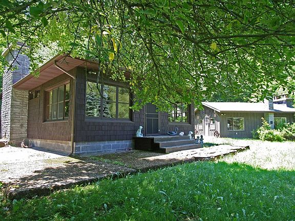 BRING THE GANG to this private family compound! The main house features a large Great Room with one entire wall of stone block enclosing a fireplace and separate warming oven. There are three roomy bedrooms, one with its own bathroom, plus a second bathroom serving the other two bedrooms, as well as a separate, convenient, laundry room. Both bathrooms were recently renovated. The four season bluestone floored sun porch across the front of the home has extensive windows and brings the outside in, making you feel part of nature as you watch deer and other wildlife wandering casually across your front yard (they love those apple trees!). This largely oak floored home also sports a state of the art propane hot water heating system. The second structure on the property was used as a fun, party, entertaining space by a prior owner, but could be finished as a studio, man (or woman) cave or any other use that occurs to you. The icing on the cake, there is an oversized 2-car garage with nice workspace area, to round out the offering. The location is the other plus about this property--about 5 minutes from downtown Margaretville, but on the edge of the Pepacton Reservoir, just minutes from kayaking and fishing--and the access to the property is very secluded, a short driveway winding through protected land to your own private 2.7 acres.