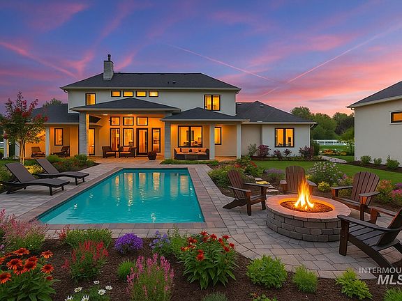 Beautifully built & professionally designed 2025 Spring Parade Home by Paradigm Construction. Tucked in a quiet, boutique community in Eagle. Minutes from golf course and convenient access to Hwy 55. Sitting on nearly 2 acres, this Modern Tudor style blends natural beauty with sophisticated design. Enjoy large, open living spaces, vaulted ceilings and a stunning 2-story stone fireplace. Large covered back patio off the great room with a full outdoor kitchen that is perfect for entertaining. Thermador appliances, exquisite finishes, and elegant selections throughout. Spacious butler's pantry boasts additional refrigerator, sink and double-ovens. The wine cellar and formal dining space complete with high-top bar area provides a luxurious living experience. Spacious primary suite with secondary suite on main level. Plenty of additional storage and parking in the 1,632 sqft. detached RV shop. Come build your dream backyard pool and garden sanctuary!