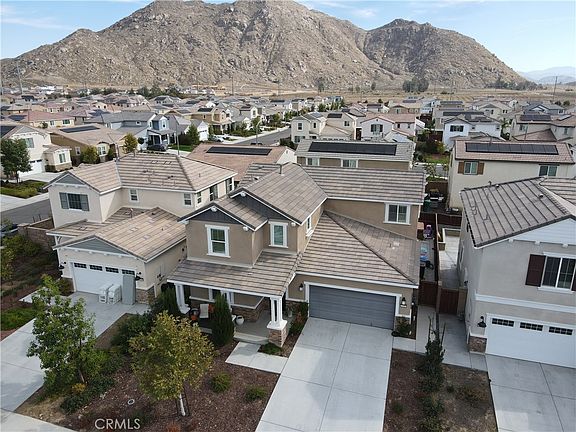 Welcome to your dream home nestled in the highly sought-after community of HERITAGE LAKE. Seller offering $5000 in Seller Concessions to be used towards Mortgage Rate Buydown and/or Closing Costs. This home is spacious, beautiful 4-bedroom, plus bonus room with a door and 3-bathrooms. Conveniently located downstairs, one bedroom with full bathroom perfect for office space or overnight guest visits. The heart of the home is the open-concept kitchen, complete with large island seating for four, pendant lighting, abundance of counter space for the chef to prep meals for gatherings and entertaining your family & friends. Beautiful white cabinets with granite counter tops, upgraded hardware, stainless steel appliances, lots of storage space and a built-in pantry. Effortlessly transition to your oversized living room to entertain, relax and enjoy movie nights. Beautiful large windows and slider bringing in lots of sun light to your home while enjoying the lovely Southern California weather. Wind down the day in your own private sanctuary, the primary bedroom is complete with spa-like ensuite bathroom with a walk-in shower, double sinks and two walk-in closets. Upstairs also features two additional bedrooms, bonus room with a door and another full bathroom. Enjoy the Southern California lifestyle with the seamless indoor-outdoor flow while relaxing outdoors enjoying evening wine, dining al fresco or making smores at your fire pit. Backyard featuring large concrete patio perfect for barbecuing & entertaining guests. Along with artificial turf in the backyard ideal for kids play and more space to create your own garden. One of the community pools located on your own block!! A very short walk to the pool to simply take a quick dip, family time or relax and unwind. Laundry room with cabinets providing lots of storage and hanging pole for laundry, Tankless water heater, smart home features, AC, quiet cool whole house fan, Solar panels. This lovely, friendly HERITAGE LAKE community amenities include a lake that allows paddle boats, catch & release fishing (residents only), Two pools, splash pad, playground, clubhouse hosting events & activities, walking trails around the lake, picnic area and nearby city Sports park. Conveniently located in Menifee near schools, shopping, dining, freeways and down the road beautiful Temecula wine country.