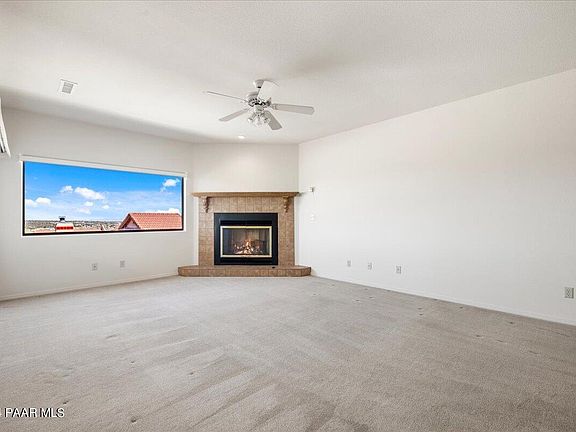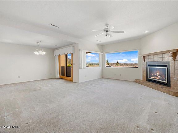 We are excited for you to explore this well maintained split floor plan home with 3 bedrooms and 2 full bathrooms w/ 1722 sf. Discover two fire places one in the living room and a second primary suite. Once you walk in you will love the scenic views where you can see Granite Mountain and the San Fransisco Peaks. The garage has extra storage and enjoy laundry in the home. We are excited for you to see this home for yourself.