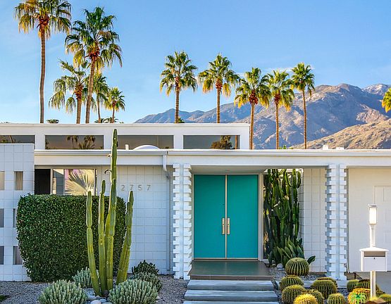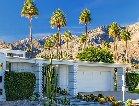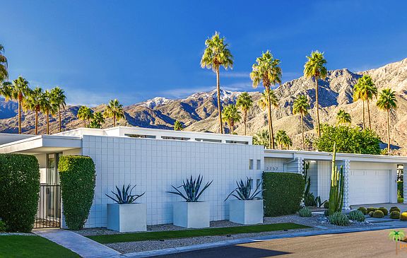 Here is your chance to own a piece of Palm Springs' rich architectural history! The Kings Point community in the Indian Canyons area of south Palm Springs features 44 homes designed by acclaimed modernist architect William Krisel, AIA. This nearly 3,000 square foot home showcases brilliant examples of International Style midcentury architecture such as floating roof lines with clerestory windows. You will love the open floor plan with 12 foot ceilings, large chef's kitchen with high-end appliances, and oversized master bedroom with walk-in closet and luxury bathroom with a dual marble shower and double sinks. Each guest bedroom features an en suite bathroom and sliding glass doors. The sweeping panoramic views of the mountains and countless palm trees seen from the walls of glass throughout the home are truly breathtaking. The home is adjacent to one of the community's two beautiful resort style pools and spas, and there are 4 community tennis courts and a clubhouse.