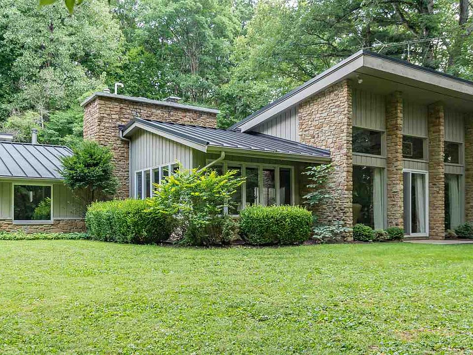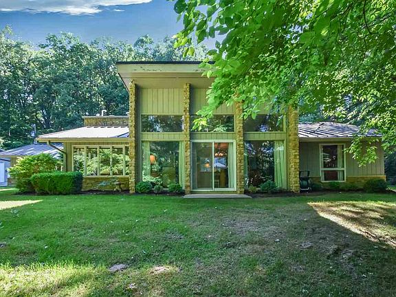 Surround yourself in wooded beauty on a long private drive in this impeccable mid-century ranch home on Bloomington's north side. Conveniently located near Indiana University and Griffy Lake, this home has a retreat feel with a secondary chalet at the base of the property. This updated 1973 home has been in the same family since built and has vaulted ceilings, natural stone wall in great room, wood burning fireplace, Andersen windows, cedar exterior, big secondary bedrooms, big master suite with walk in and access to courtyard pool. This split bedroom seventies modern has an updated kitchen with natural stone, wet bar in great room, dining room, grass cloth wall coverings, two zoned heating systems-one replaced 2016 is gas and the second in a heat pump. The kidney shaped pool is easy to maintain concrete with stainless walls and there is a covered patio for great entertaining. There is a small pool storage building, a large 44' x 25' hobby garage in addition to the attached 2.5 car garage. This spectacular home is pristine and has a special wooded setting near recreation, campus and shopping.