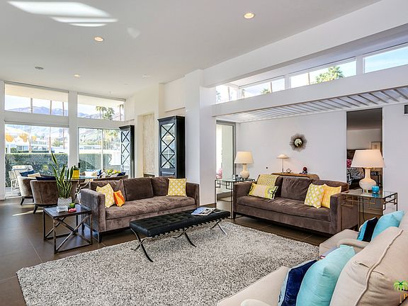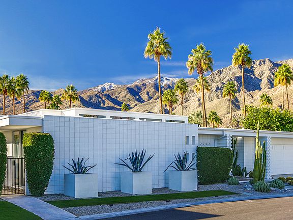 Here is your chance to own a piece of Palm Springs' rich architectural history! The Kings Point community in the Indian Canyons area of south Palm Springs features 44 homes designed by acclaimed modernist architect William Krisel, AIA. This nearly 3,000 square foot home showcases brilliant examples of International Style midcentury architecture such as floating roof lines with clerestory windows. You will love the open floor plan with 12 foot ceilings, large chef's kitchen with high-end appliances, and oversized master bedroom with walk-in closet and luxury bathroom with a dual marble shower and double sinks. Each guest bedroom features an en suite bathroom and sliding glass doors. The sweeping panoramic views of the mountains and countless palm trees seen from the walls of glass throughout the home are truly breathtaking. The home is adjacent to one of the community's two beautiful resort style pools and spas, and there are 4 community tennis courts and a clubhouse.
