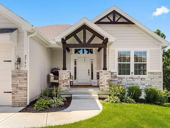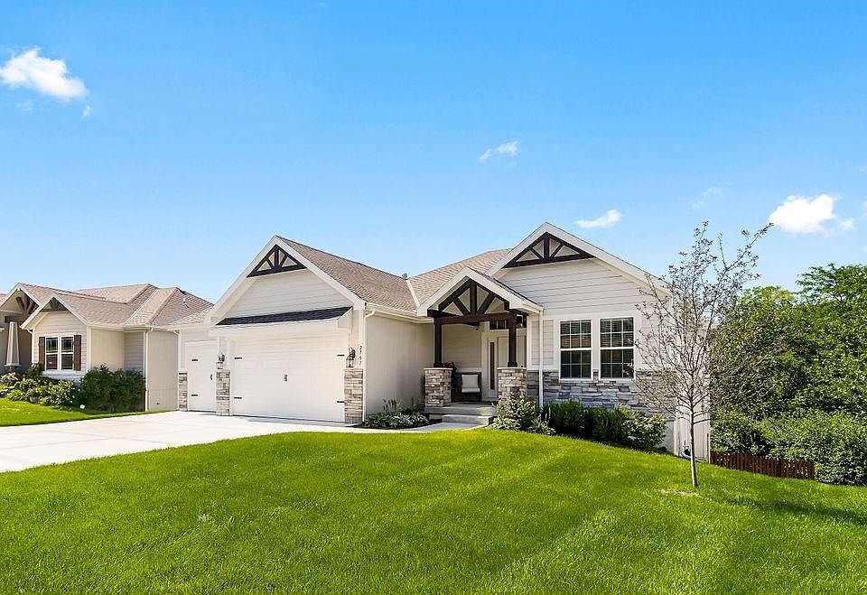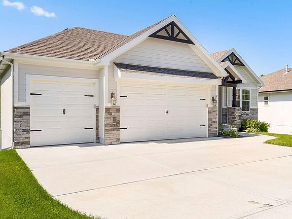 Impressive Reverse 1.5 Story backing to mature trees, enjoy the private screened deck with fireplace. Home offers many upgrades, including Quartz countertops throughout, tile to ceilings in all showers, upgraded paint, upgraded carpet on stairs, upgraded black hardware, upgraded light fixtures, enlarged cement slab at back of home, upgraded to fescue grass, fence, irrigation to cover front and back yard, 2" faux wood blinds throughout. All this and yet huge raw storage or room to finish for a true theater room or gym, in addition a storm room is included to keep you safe in the event of severe weather. ELECTRIC CAR CHARGING in garage, Wifi app garage door controls, home is set up for google fiber or AT&T fiber. Nest thermostat with one room sensor. This home backs up to the newly renovated Lake Olathe property offering a ton of outdoor activities such as swim beach, marina, & more. Prairie Farms is a fantastic and friendly community with a large pool, cabana, play area and amazing walking trails that starts right behind this home. Sq ft is an estimate. ** PLEASE CHECK OUT THE MATTERPORT 360 VIDEO**