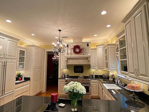 Kitchen with large bar, upper and lower and interior cabinet lighting, 6 burner gas stove with grill and double ovens