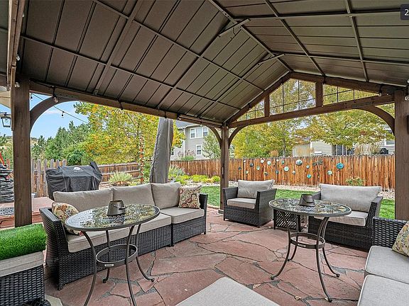 Enjoy Colorado living at its best in the expansive backyard with a flagstone patio and a 12' x 14' gazebo with privacy blinds - ideal for relaxing evenings outdoors.