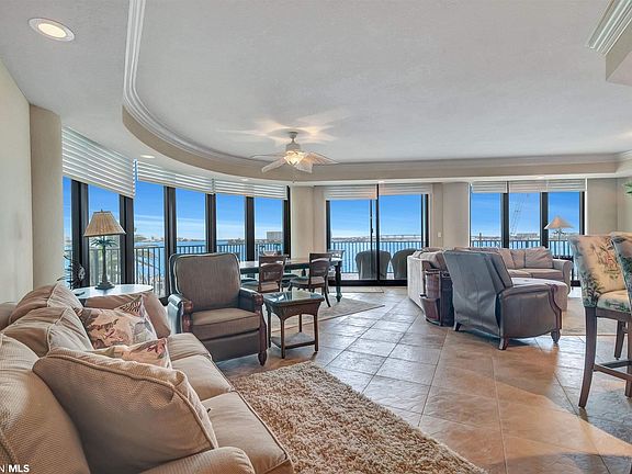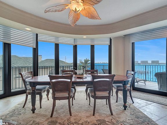 RARE FIND with unparalleled views of Terry Cove, Robinson Island and Perdido Pass. This SE corner double unit at luxurious Phoenix on the Bay has 4374 sq ft, two master suites, two balconies, a 40' deeded boat slip and two garages plus three additional en suite bedrooms and two additional half baths. Mediaroom with comfortable theatre seating. Huge master suite includes its own private direct view balcony, sitting area, wet bar and one full bathroom with jetted tub and shower and an additional half bathroom. The huge open kitchen with granite countertops has its own view too so you never lose sight of the water. Unit also has two laundry rooms. Sold fully furnished this beautiful unit has never been rented. Property amenities include tennis courts, two outdoor pools, a lazy river, putting green, sauna, marina and boat launch. It is the perfect hide a way for those seeking privacy and luxury or a great property for the investor.