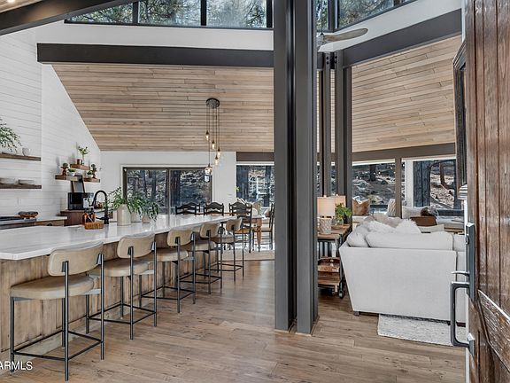 This newly remodeled 2,733 sq.ft. cabin can be your Flagstaff Mountain getaway and with the furnishings and décor available on a Separate Bill of Sale this home is truly move in ready. This home is all single level and features 3 bedrooms and 3 bathrooms, it's perfect for entertaining as the kitchen, living room and dining area flow seamlessly together. Upon entering the home, you are greeted by an expansive whitewashed stoned fireplace, and hearth. The open kitchen features an oversized quartz island with a double farm sink and seating for five, a four-burner gas range, refrigerator and two freezers with paneling that matches the cabinetry throughout, and a built-in microwave. Just off the kitchen is a bar and dining area which is surrounded by a wraparound built-in bench overlooking the beautiful outdoor scenery.