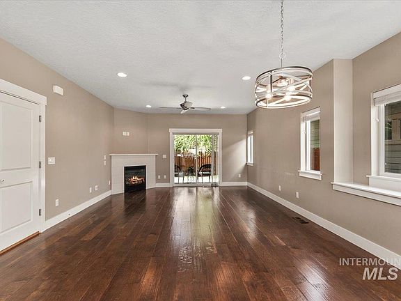 Nestled on a corner lot, minutes from Barber Park and Bown crossing, this SE Boise home is perfect for someone looking for low maintenance living or to use as an investment property. The main level welcomes an open great room layout with hand hewn, engineered hardwood flooring. The kitchen includes custom granite countertops, pendant lighting, and stainless steel appliances. Upstairs, find a spacious primary with partial views of the Boise foothills. The en-suite bathroom showcases a large quartz double sink vanity, glass walk-in shower, and large walk-in closet. Accompanying this retreat are two additional bedrooms, a guest bathroom, and laundry room. Additional enhancements include a fenced backyard, wired for surround sound, and an epoxy garage floor. This residence combines contemporary elegance with practical design, in a sought-after neighborhood.