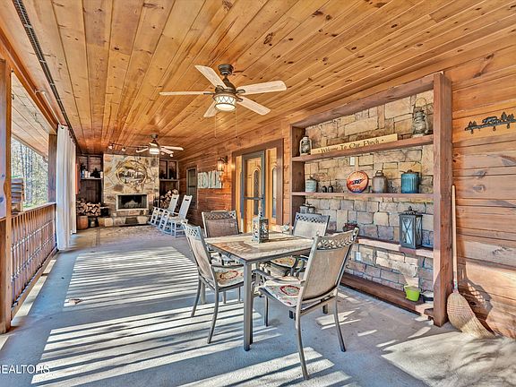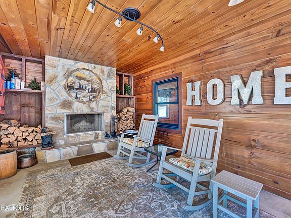 Charming 2-bed, 2-bath log cabin in the heart of Sevierville, partially furnished and completely updated! Projected financials up to 80k! This move-in-ready home features an open floor plan with classic log cabin details, a cozy fireplace in the living room, and a spacious kitchen with wooden cabinetry, sleek countertops, a large island, and stainless steel appliances, including a double oven. The primary bedroom offers ample space and a beautifully remodeled ensuite with a tiled walk-in shower and double vanity. Recent updates include a new A/C unit (2021) and a tankless water heater (2023). Enjoy the large covered porch with a wood-burning fireplace, perfect for entertaining or relaxing. Additional features include a fenced backyard with a storage shed and a rare 2-car carport. Ideal as a primary residence, vacation home, or rental property—don't miss this gem!