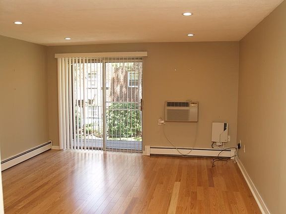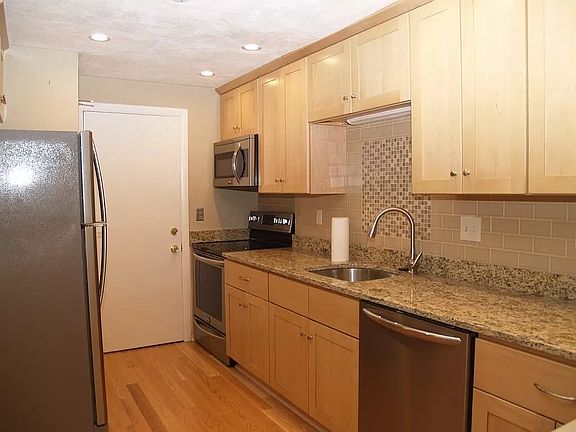Nice quiet building in great location, Close to the Commuter Rail train station, and very close to Main Street's collection of eateries, shops and grocers. 2nd floor corner unit, two bedroom one bath condo. Nicely equipped kitchen with newer stainless steel appliances including microwave and small dining space. The living room offers sunny, natural lighting with slider leading to outdoor balcony. Both bedrooms have ceiling fans with lighting. Full bathroom includes tub and shower. Laundry is available 1 story below on the ground. Unit comes with one assigned parking space and ample on street parking. 1 year