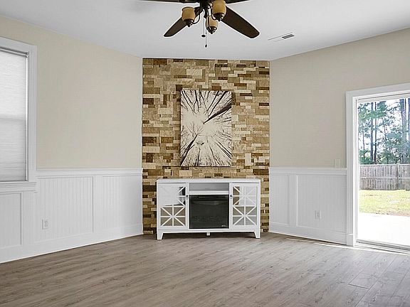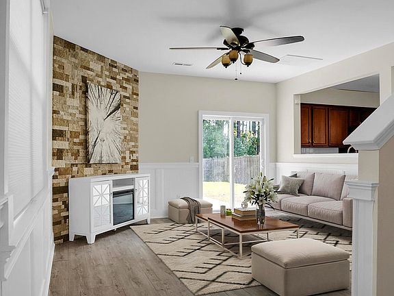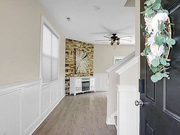 Popular Cane Bay subdivision home, with CUSTOM upgrades and finishes - including a gorgeous stone fireplace, wainscoting, and custom window and door trim. The downstairs is devoted to family living - with the family room, large kitchen, and dining area in an open arrangement. LVP wood look flooring throughout the downstairs makes maintenance a breeze! Sliding glass doors open into a privacy fenced backyard, with wooded buffer behind, and a large patio. (Yard work in progress.) Upstairs are the owner suite with private bath, two additional bedrooms and hall bath, and the laundry room. Tucked into the back corner of the upstairs is a surprisingly large loft - media room, play room, office?Freshly painted throughout, all new carpet upstairs. Two car garage completes the home! Come see!