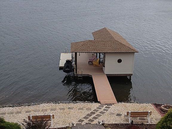 Two story home with 3 bedrooms and large 576 sq foot heated loft. 130 feet of shore line in quite cove on small slope.