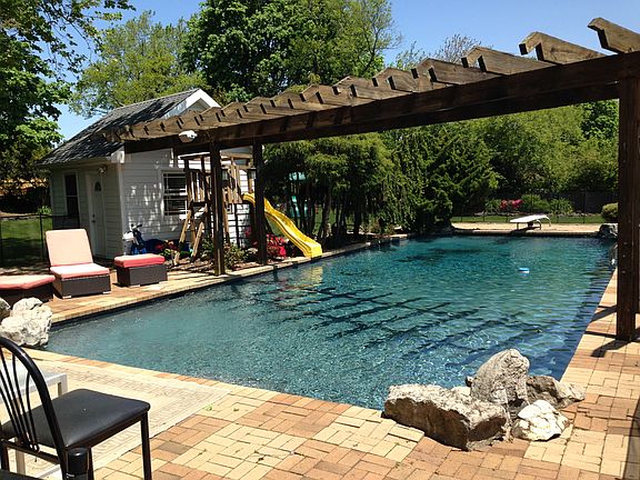 Sunny and Spacious 5 bedroom, 4 bath contemporary set on professionally landscaped 3/4 acre of resort-like property. Includes in-ground gunite pool, cabana with 4th full bath, huge outdoor enclosed porch, deck and patio, and outdoor summer kitchen. The open interior floor plan is perfect for entertaining. The main floor master suite has dramatic floor to ceiling windows, large closet and bath, and entrance to the enclosed porch and pool area. Hardwood floors. The large finished basement with high ceilings remained Sandy dry. Tax Reduction! Further Successful Tax Grievance in Process!
