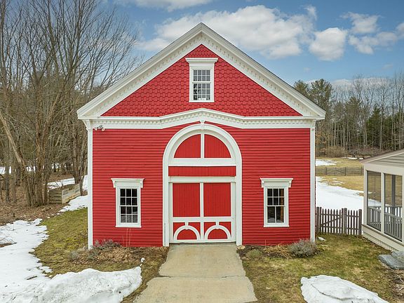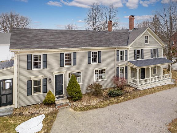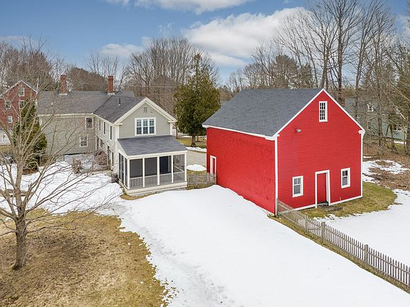 Antique colonial farmhouse is sited picturesquely on 1.7 acres in the village of Cumberland Center, and convenient to schools and town services. Classic New England design offers wide pine floors, good morning staircase, hand-hewn beams and original barn. The interior is a charming blend of the old and new, offering original features, yet affording many recent updates. There are 2 natural gas furnaces; and 2 heat pumps that provide air conditioning. Replacement windows on 2nd floor. Fireplace is non-working. Woodstove in den. A delightful screened porch overlooks the broad backyard. A spacious deck has an elaborate summer kitchen for entertaining in warmer months. Barn can house 2 cars. Upper level of the barn can be used for hobbies and storage. Productive, cultivated apple trees in the front side yard produce an abundance of apples and cider.