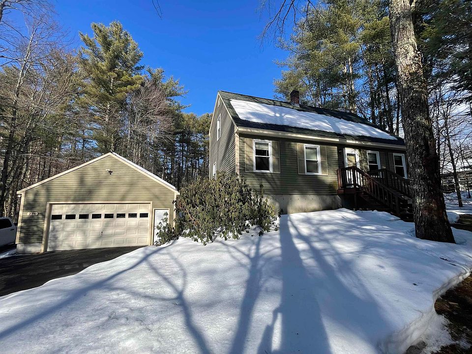 This wonderful cape home on 5.29 acres is perfect for those who like privacy and Lots of room to roam. Walking trails on the property as well as trails and snowmobiling areas nearby. 24x46 oversized phenomenal garage with room for either four cars, a workshop or lots of storage. The house has an eat-in kitchen with plenty of counter space and cabinets, and a dining room or office on the first floor. The living room is front to back, has a propane stove creating a cozy space and sliders to a large 12x20 foot deck overlooking the backyard views. There are three bedrooms with the primary bedroom having a beamed cathedral ceiling and there are two full baths and plenty of area in the unfinished basement to either finish additional rooms or for projects or storage. Basement walks out to the garage and there is a paved driveway. Easy to show and ready to go! OFFER DEADLINE 8 PM WEDNESDAY3/6