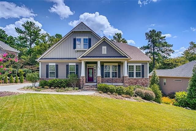 Craftsman style 2-story home built in 2017 with a main level owner's suite, open floor plan, large spacious kitchen, five bedrooms, three bathrooms, a home office, and a 2,500 square foot unfinished basement that's insulated and plumbed for a future renovation. The home is located in Heron Cove, a custom home community located in Lake Wylie, and features: oak hardwood floors, 10' ceilings, 8' doors, granite throughout, a large stone fireplace, dog wash, ceramic tile floors, walk-in closets and a whole house water filtration system. The home sits on approximately 1/3rd of an acre which backs up to a wooded area, has a three car garage, and is walking distance to the lake. Community boat storage is available.