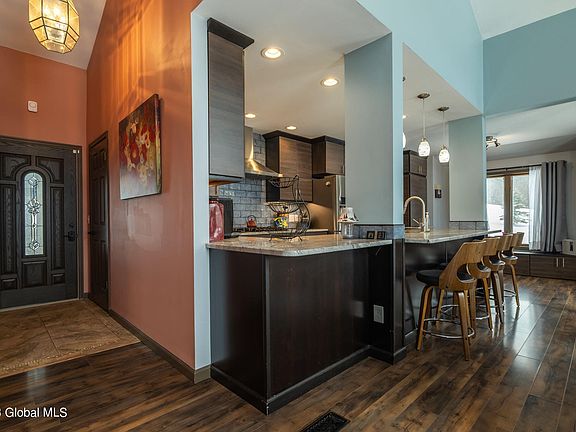 Retreat to a lavish country getaway! 2600sqft Custom Ranch w/ finished lower-level set on 5ac. Secluded mountain road leads to stunning home complete w/ updated gourmet kitchen w/ stainless steel appliances & granite countertops, formal dining room, family room w/ fireplace & dry bar, updated formal living room w/ fireplace flanked by quarter arch and picture windows bringing plenty of natural light; primary bedroom has walk in closet & full bath. Lower level features wine room, 2nd bedroom w/ in-law potential and 2nd family room w/ gas stove & 3rd bedroom potential; Outdoor kitchen customized in '19 covered by timber-frame pavilion w/ built in pizza oven, gas grill; heated 2car garage, blacktop driveway; roof replaced in '21, seller owns solar panels installed in '22 & new 2022 generator