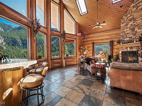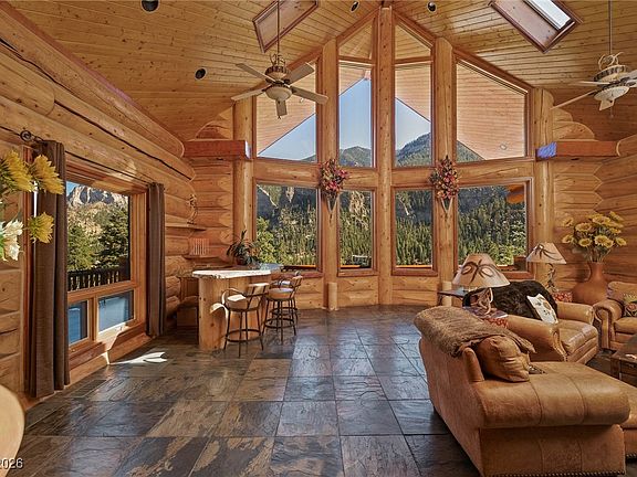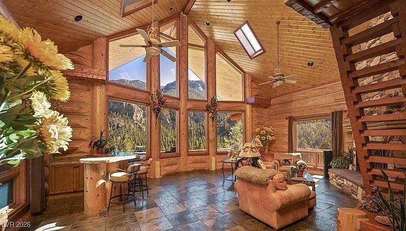 Perched high on Mt. Charleston just minutes from Las Vegas, this bespoke log estate blends serenity, craftsmanship, and modern indulgence, offering five bedrooms, six baths, and over 1,500 sq ft of wrap-around decks with sweeping mountain vistas; inside, hand-hewn logs, bronze sculptures, and custom wrought-iron furnishings complement hydronic heated floors extending through the home, balconies, and even the driveway, while a chef’s kitchen with Viking appliances, double ovens, dual dishwashers, a Sub-Zero wine cooler, and rough-cut granite anchors amenities including a private theatre, full gym, executive office, wine cellar, and spa-inspired baths, all enhanced by three fireplaces, smart-home integration, abundant storage, an oversized garage, and fully included custom furnishings and curated artwork for a turnkey mountain sanctuary.