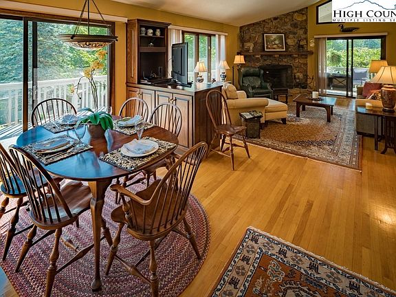 Native landscaping and an inviting front entrance welcome one to this lovely home. Exquisite stone detail adds to the charm of this attractive mountain home. Upon entrance, there is a bright and airy living room that features hardwood floors, vaulted ceilings, an abundance of windows, and a stone, gas-log fireplace. The dining room has long-range views and sliding glass doors that open up to a wrap-around open and covered deck. The kitchen has newer appliances and cabinets with a very nice pull-out pantry. The home has a spacious primary bedroom on the main level with an adjoining full bathroom. The home also has a lower-level laundry room, bedroom, a den-bedroom with a kitchenette, a full bathroom, and a separate entrance. There is also downstairs parking along with covered golf cart parking. This home has beautiful natural light and ample storage. It would be a lovely primary residence or a second home. Most furnishings convey. See the exclusions list for exceptions.