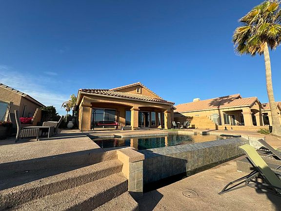 Enjoy the River Lifestyle to its fullest with this primely positioned 3 bedroom, 2 bath home. The lifestyle you've have always wanted & deserved with the scenic, stunning, unobstructed shimmering views of the river & the infinity pool right out your back door. From the moment you step into the foyer you will know this is a special home for sharing with family & friends. As the home unfolds before you, your immediate focus may take you to the awe-inspiring expanded views of the Colorado River. Perhaps your eyes capture the spacious living room with natural sunlight and the sprawling open floor plan. Then again, you may divert to the well appointed kitchen that any chef would envy with stainless steel appliances, propane gas stove & oven, nice cabinetry, granite countertops and tile flooring. Home has a spacious 2 car garage, full RV hookups, RV & boat parking. Whichever, you'll be captivated & know there is much more yet to see.The ambiance day or evening will sweep you into your own oasis.