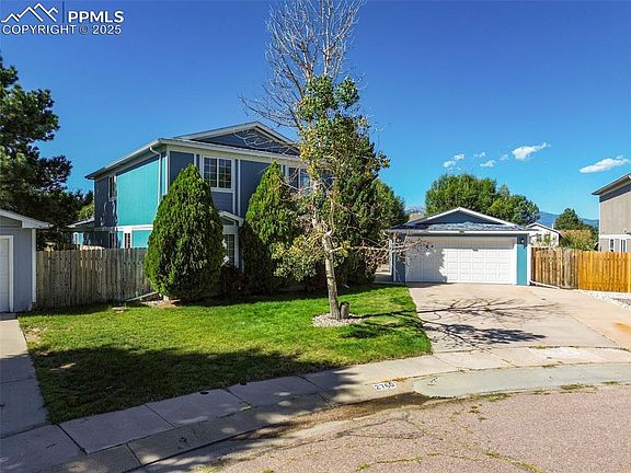 don't miss out on this property! Wonderful 2 story home sits on a large lot off a cul-de-sac with Pikes Peak and mountain views. New carpet throughout and two Primary Suites, providing the flexibility to use the main level Primary Suite as a multi-generational living/mother-in-law suite or easily convert to an owner occupied Short Term Rental to generate additional income. Enjoy soaking in the massive hot tub in a separate room off the main level primary suite. The layout of the home is great for living and entertaining with a large living room/dining room, eat in kitchen, a separate family room with a fireplace, and a 1/2 bath on the main level for guests to use. Newer roof installed in 2024 and newer furnace as well. Protect your vehicles from the elements with the oversized 2-car detached garage. The large yard is fully landscaped with lush green grass and xeriscaping, while fully fenced with privacy fencing around all the lot borders. Come see this home right away before it's gone!