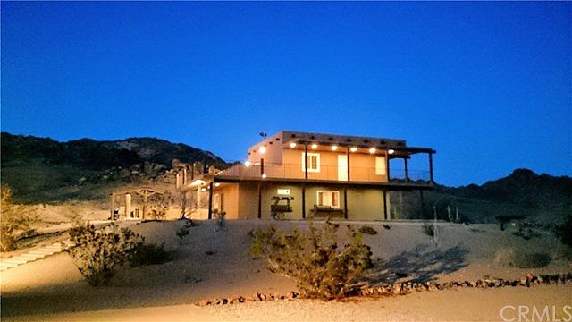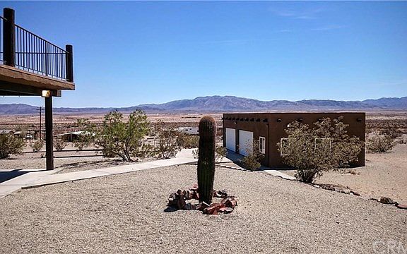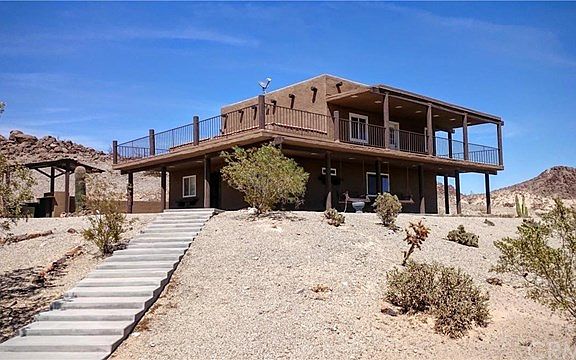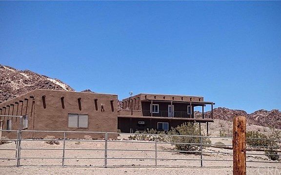At the end of the dusty trail and against the mountainside with endless open and dedicated land behind it you will find a CUSTOM BUILT, solid as a rock TWO STORY Santa Fe style Estate. This property itself has 5 full acres HORSE CORRAL & BARN. The main house is 2048 square feet with a wrap-around upper patio, central heat and brand new A/C, Built-in Wet Bar as well as a lighted built-in Gun Cabinet. With a matching design there is a 4-car detached garage boasting 9-foot bay doors and a 200 square foot office area and a 1/2 bath. The total living space is 2648 square feet under two roofs and a very private and secluded desert retreat for the equestrian buyer or anyone looking to get away from it all and rest peacefully with no interruptions. Find any constellation and explore the Milky Way from the privacy of your upper-deck patio. Grow your own or go solar and live almost completely off-grid. The area offers horse trails and endless hiking as the property sits up against miles and miles of government-owned empty land. Energy efficient doors and windows add to the comfort and privacy of this incredible estate.