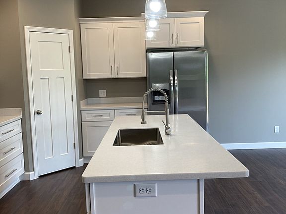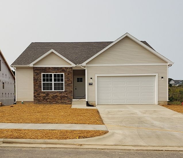 This beautifully finished, movie-in ready home sits on a Northeast facing lot with views of the Harrison Ridge pond. The open concept living area feels even larger with cathedral ceilings and a fireplace. A large island between the kitchen and dining area is perfect for bar stools and entertaining. The kitchen features white cabinets and an oversized pantry. Other gems of this home are the mudroom directly off the garage and a pocket office that remains private with a stylish barn door. The master suite features a ceramic tiled shower and large closet. Two more bedrooms and a full bathroom are at the front of this home and a deck is off the back. This home sits on a lookout basement full of unfinished potential. Don't miss this home, it won't last long!